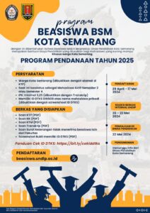 Bersama ini diberitahukan bahwa Dinas Pendidikan Kota Semarang membuka pendaftaran Beasiswa Miskin Berprestasi khusus untuk warga Kota Semarang dengan persyaratan sebagai berikut: Warga Kota Semarang