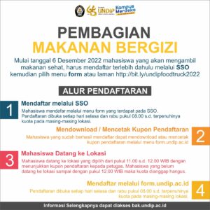 - Mulai 6 Desember 2022, mahasiswa yang akan mengambil makanan sehat harus mendaftar terlebih dahulu melalui https://form.undip.ac.id/makanansehat/pendaftaran