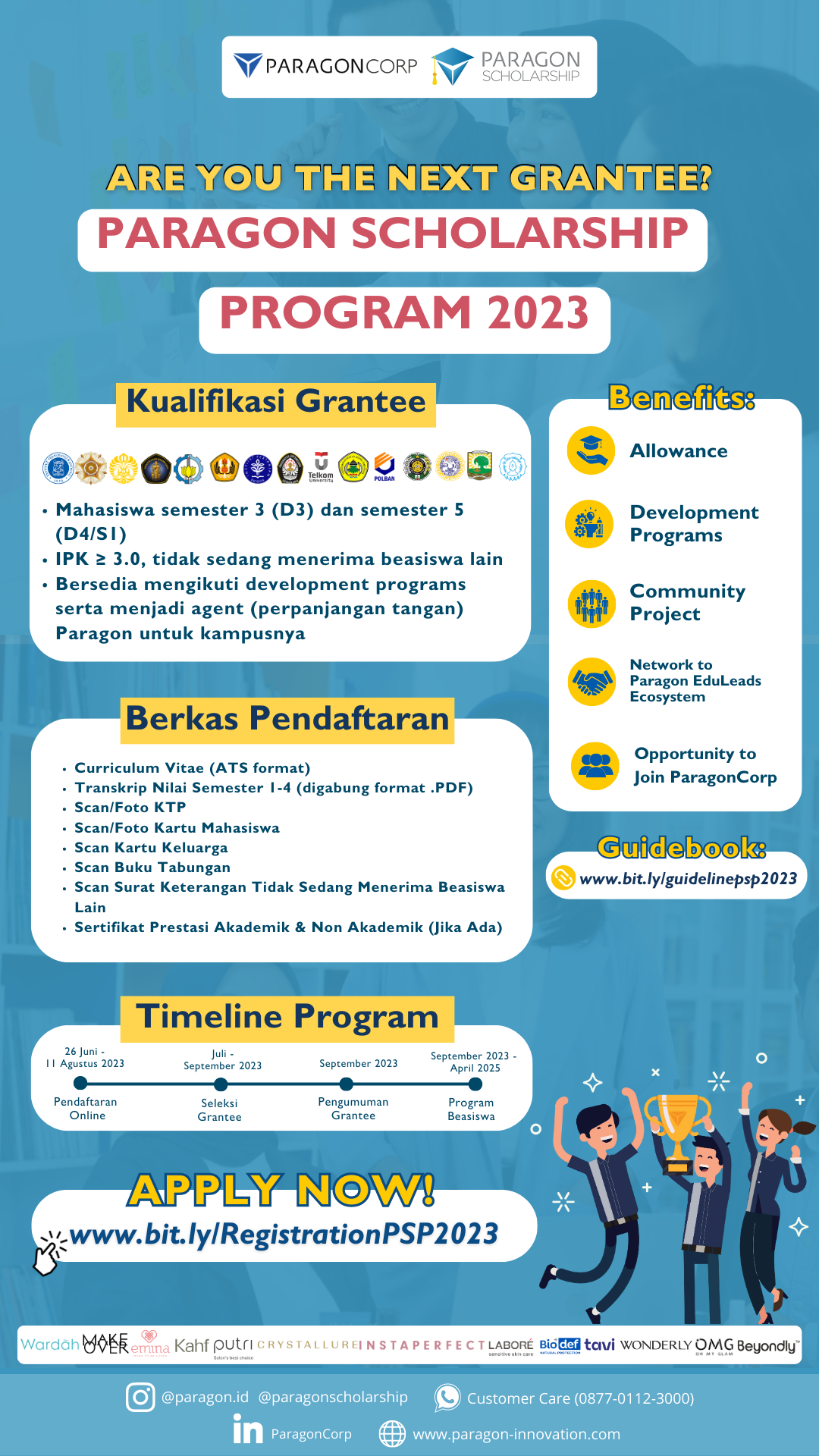 Based on the announcement from PT. Paragon Technology and Innovation regarding the plan to open the 2023 Paragon Scholarship Program (PSP) Scholarship, we herewith convey that Paragon is providing opportunities for Diponegoro University students to get Paragon Scholarships Scholarship Program (PSP) in 2023 with the conditions of the scholarship: