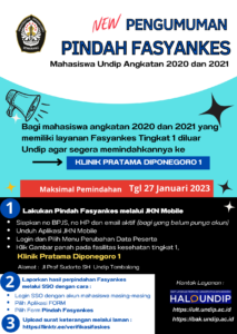 We inform all Undip students batch 2020 and 2021 to immediately move health facility services to Diponegoro Primary Clinic 1 according to the provisions of