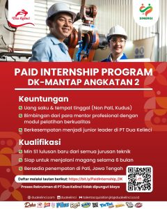 PT Dua Kelinci menghadirkan DK-MANTAP (Manufacturing Acceleration Program), program magang berbayar yang dirancang khusus untuk lulusan baru. Dalam program ini, kamu akan mempelajari langsung proses manufaktur, kontrol kualitas, pemeliharaan mesin, hingga analisis kinerja produksi. Kamu juga berkesempatan terlibat dalam proyek-proyek menantang dan mempersiapkan diri menjadi bagian dari pemimpin muda PT Dua Kelinci.