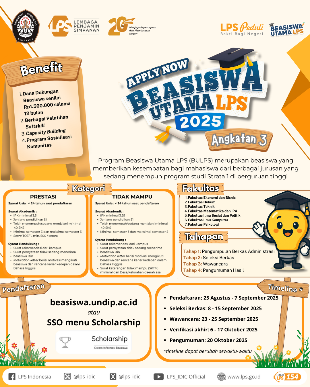Bersama ini kami beritahukan bahwa Lembaga Penjamin Simpanan (LPS) Tahun Akademik 2025/2026 menawarkan Beasiswa Utama LPS 2025 Angkatan 3 kepada mahasiswa di lingkungan Universitas Diponegoro. Adapun persyaratan dan kelengkapan berkas untuk mendapatkan beasiswa sebagai berikut :