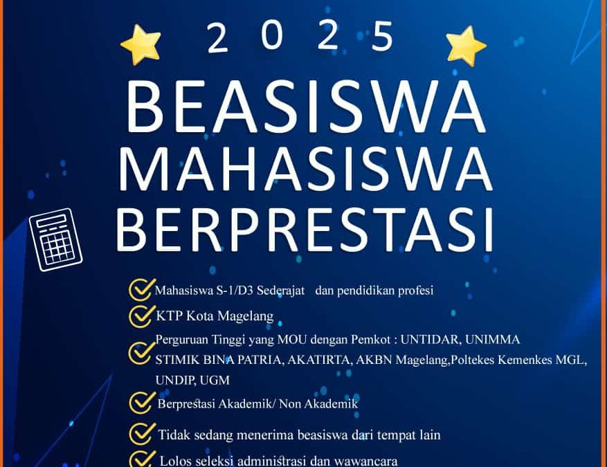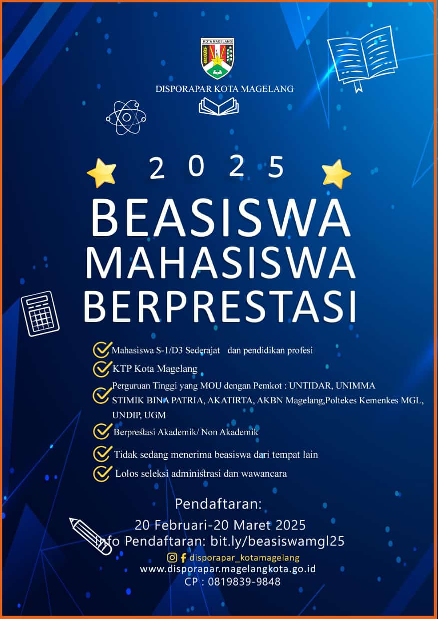 Universitas Diponegoro bekerja sama dengan Kota Magelang akan membuka pendaftaran Beasiswa Mahasiswa Berprestasi Kota Magelang Tahun 2025. Adapun persyaratan beasiswa sebagai berikut: