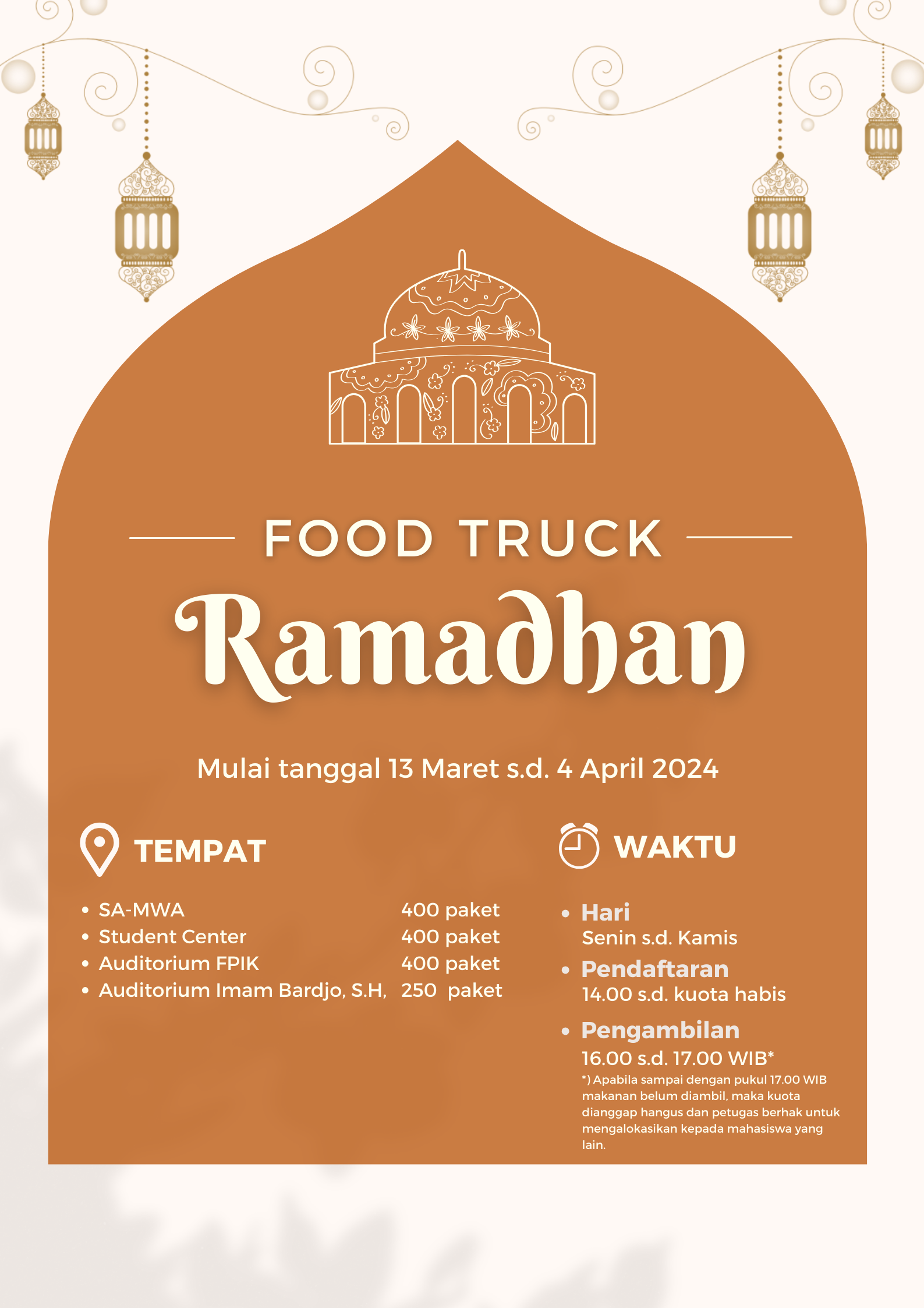 Sehubungan dengan telah memasuki Bulan Ramadan 1445 H, maka perlu dilakukan penyesuaian pembagian kuota makanan sehat (food truck) selama bulan Ramadan 1445 H dengan ketentuan sebagai berikut: