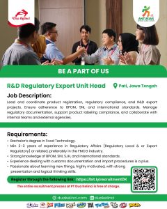 Dua Kelinci is currently offering career opportunities. Ready to take your career global? Join our dynamic team as a R&D Export & Regulatory Unit Head and be part of an exciting journey!