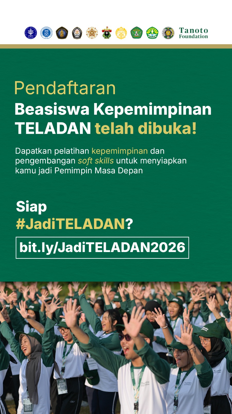 Berdasarkan surat No. 0500/TF-JKT/VII/2025 perihal Permohonan Publikasi Pendaftaran TELADAN Cohort 2026 tanggal 3 Juli 2025 dari Head of Leadership Development and Scholarship Tanoto Foundation, bersama ini kami sampaikan bahwa Tanoto Foundation memberikan kesempatan kepada mahasiswa Universitas Diponegoro untuk mendapatkan program beasiswa kepemimpinan TELADAN Tahun 2026 dengan ketentuan beasiswa tersebut: