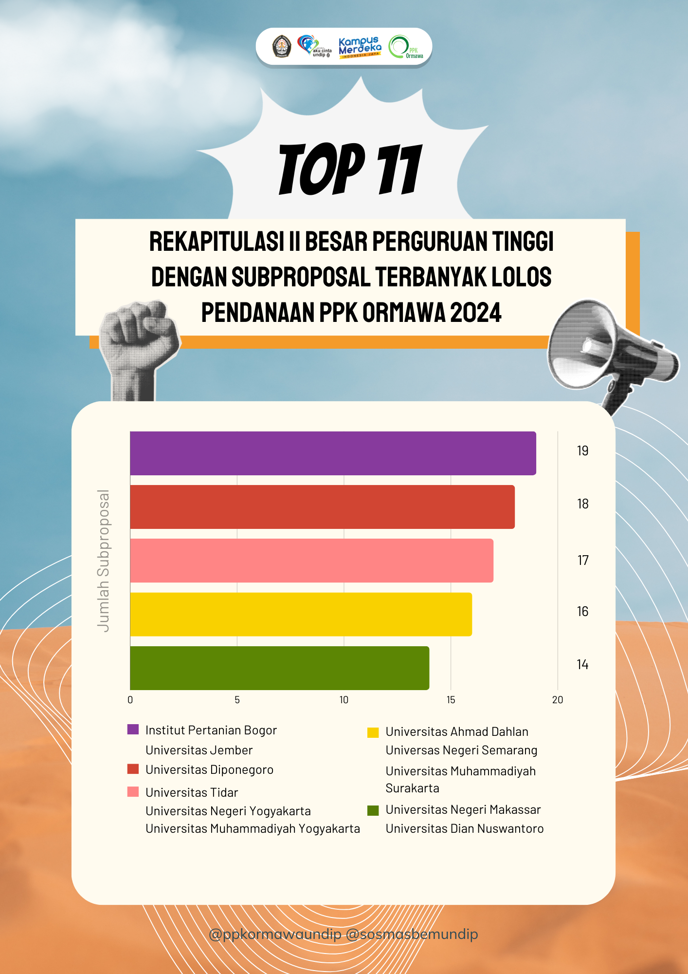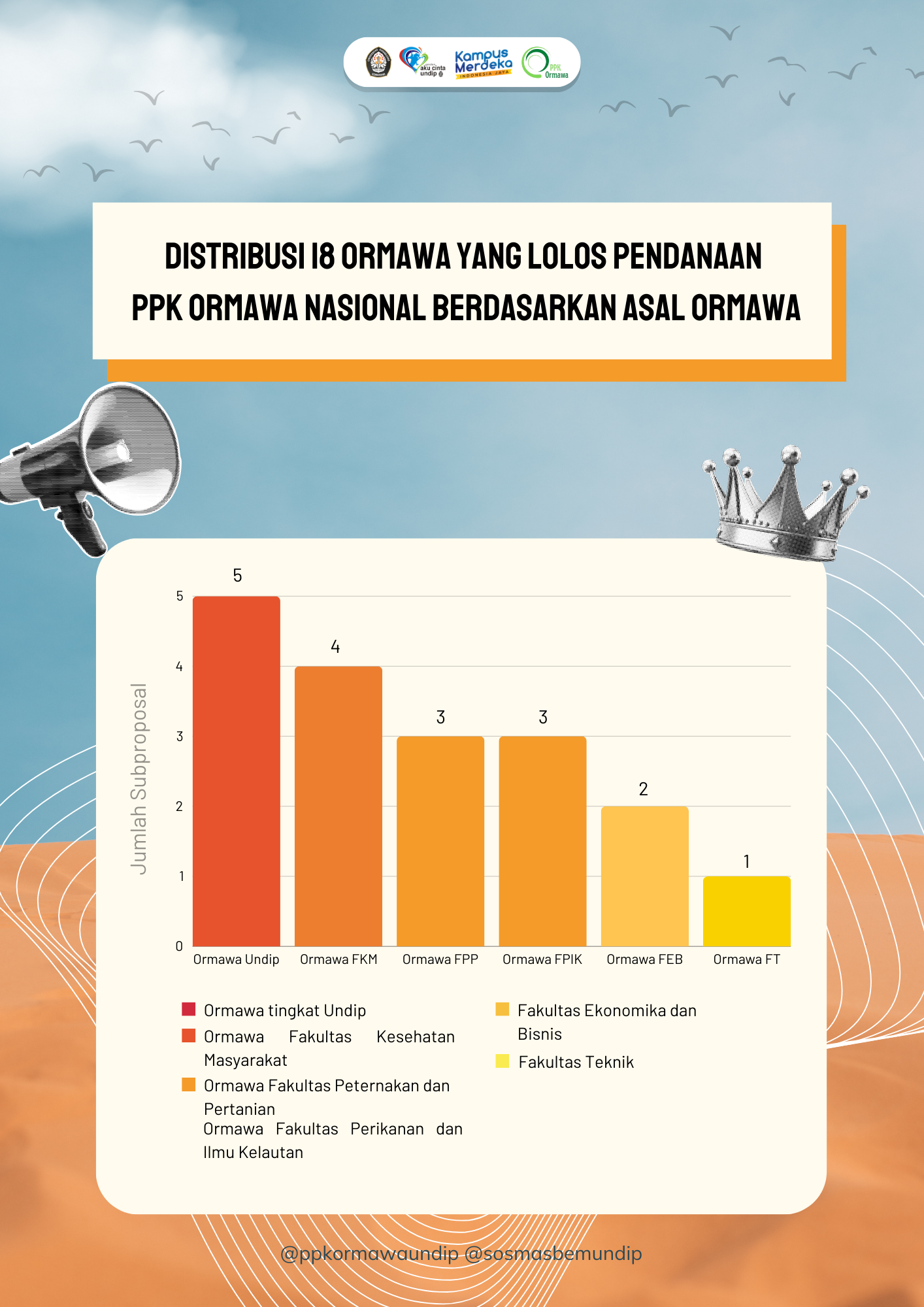Setelah mengikuti seleksi nasional tim PPK ORMAWA Universitas Diponegoro lolos untuk mendapatkan pendanaan. Dari 20 tim PPK ORMAWA yang mengikuti seleksi , sebanyak 18 tim PPK ORWAWA lolos mendapatkan dana PPK ORMAWA nasional.